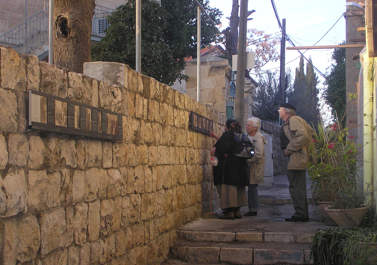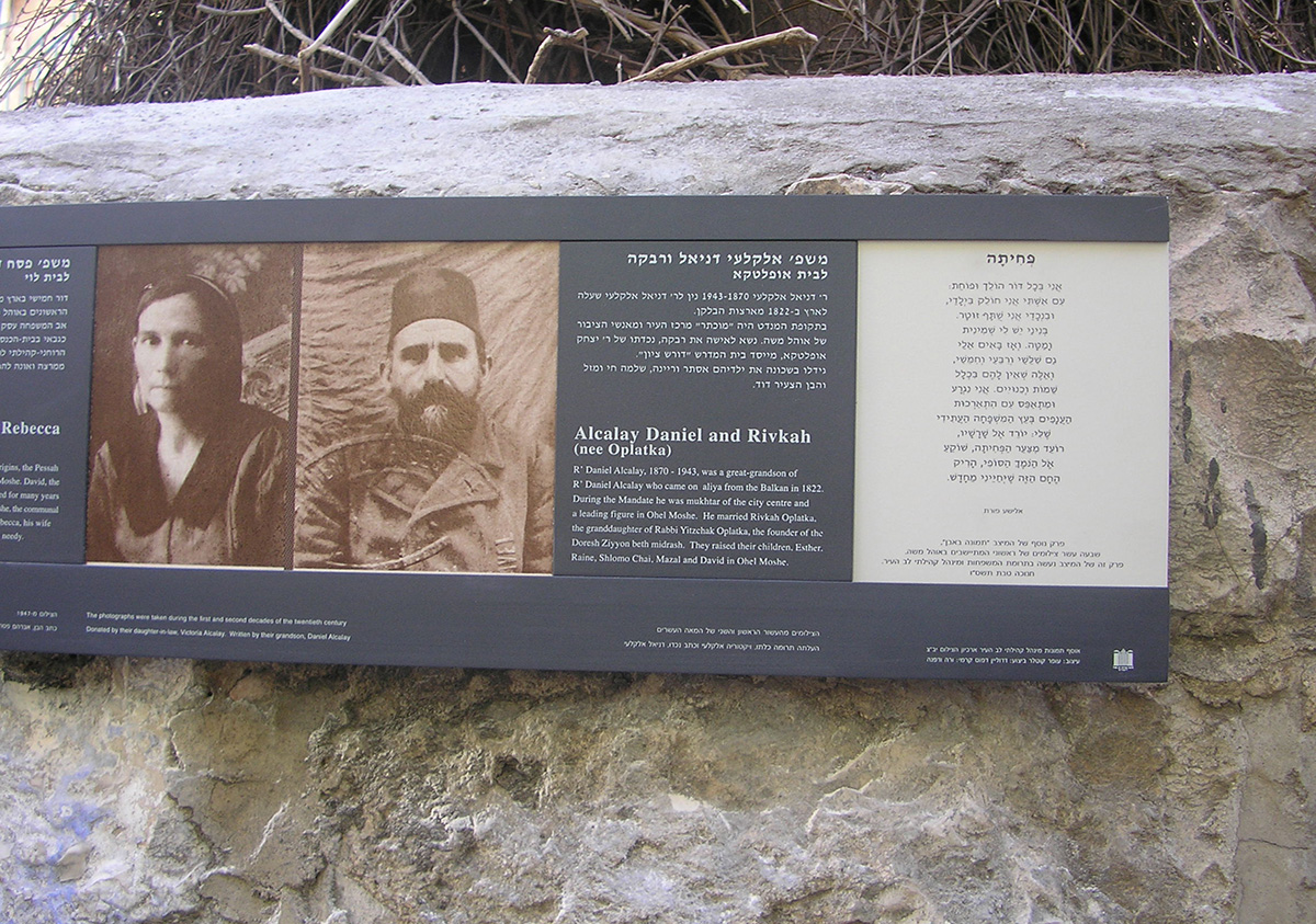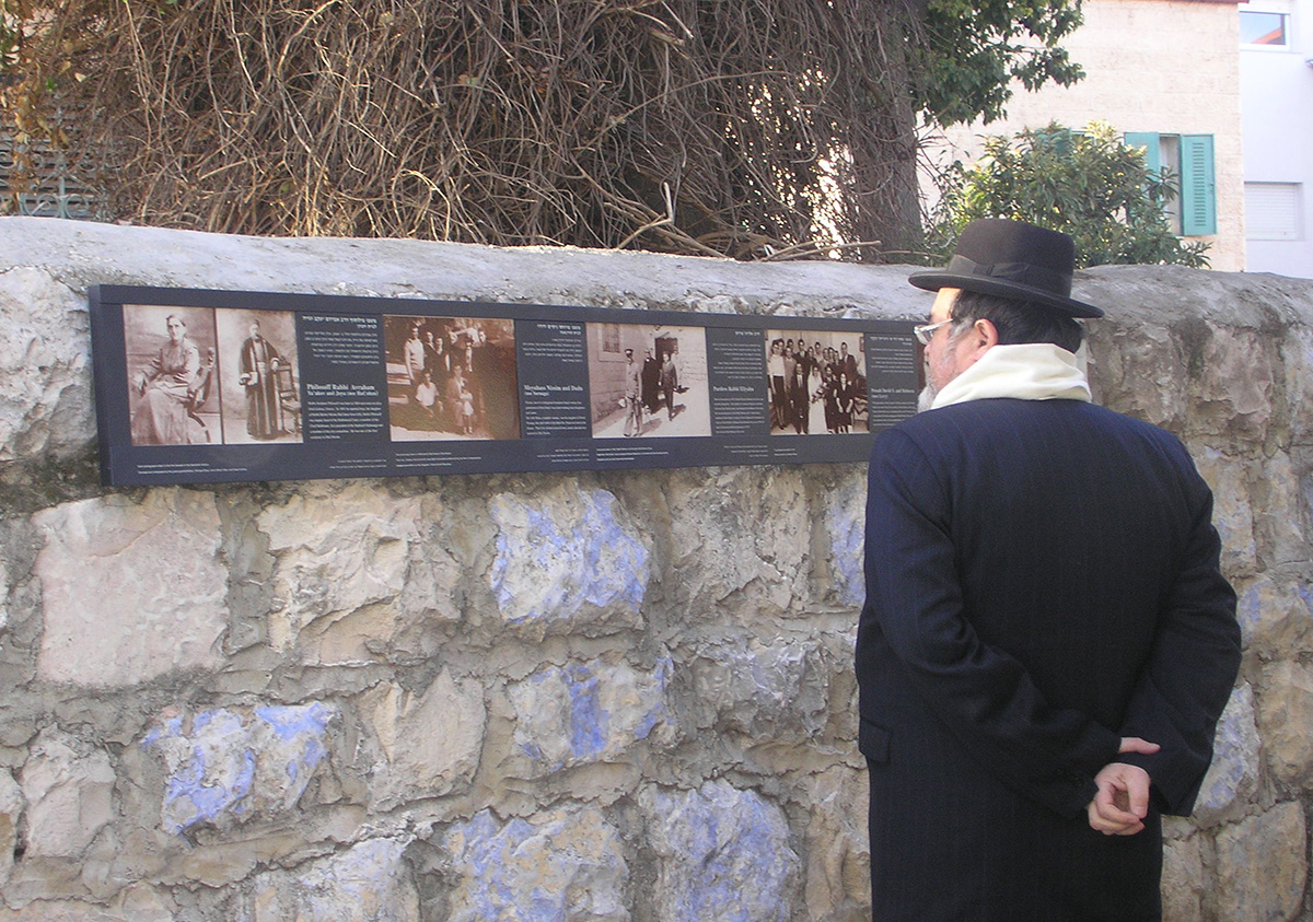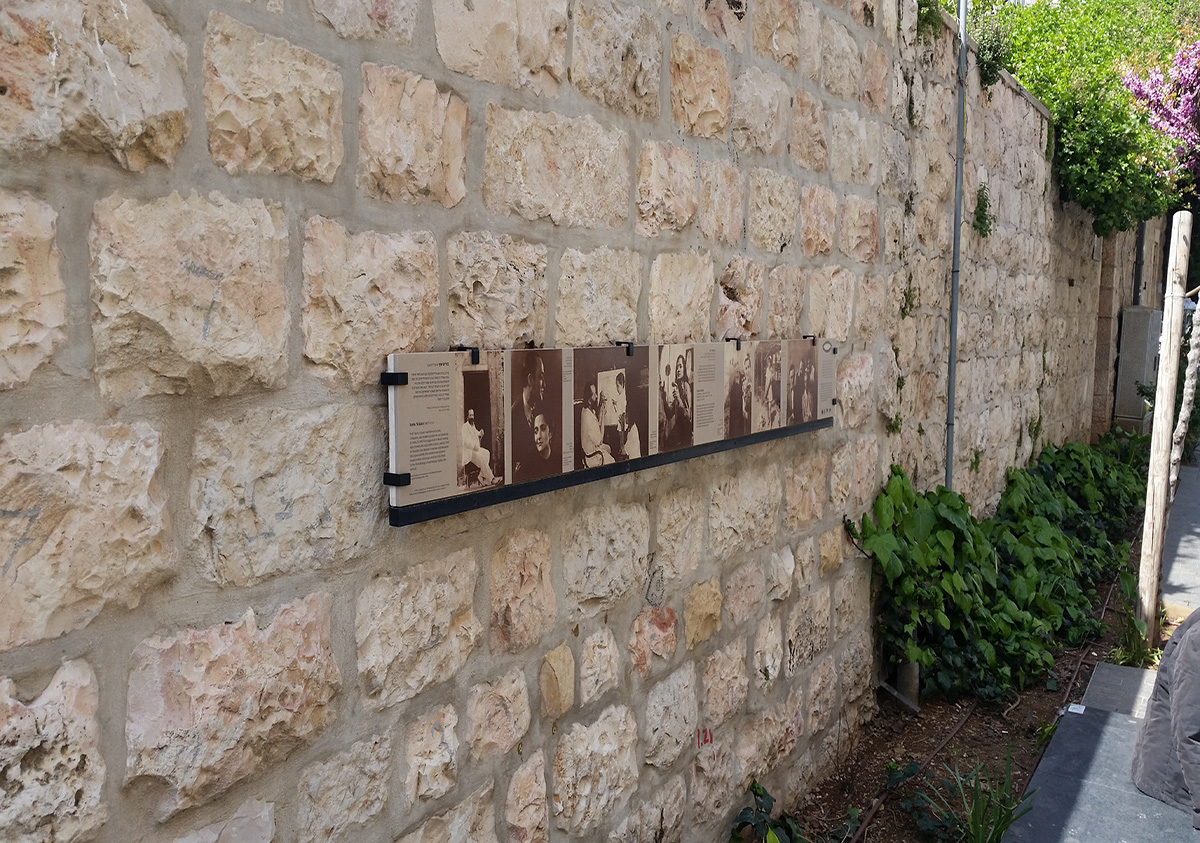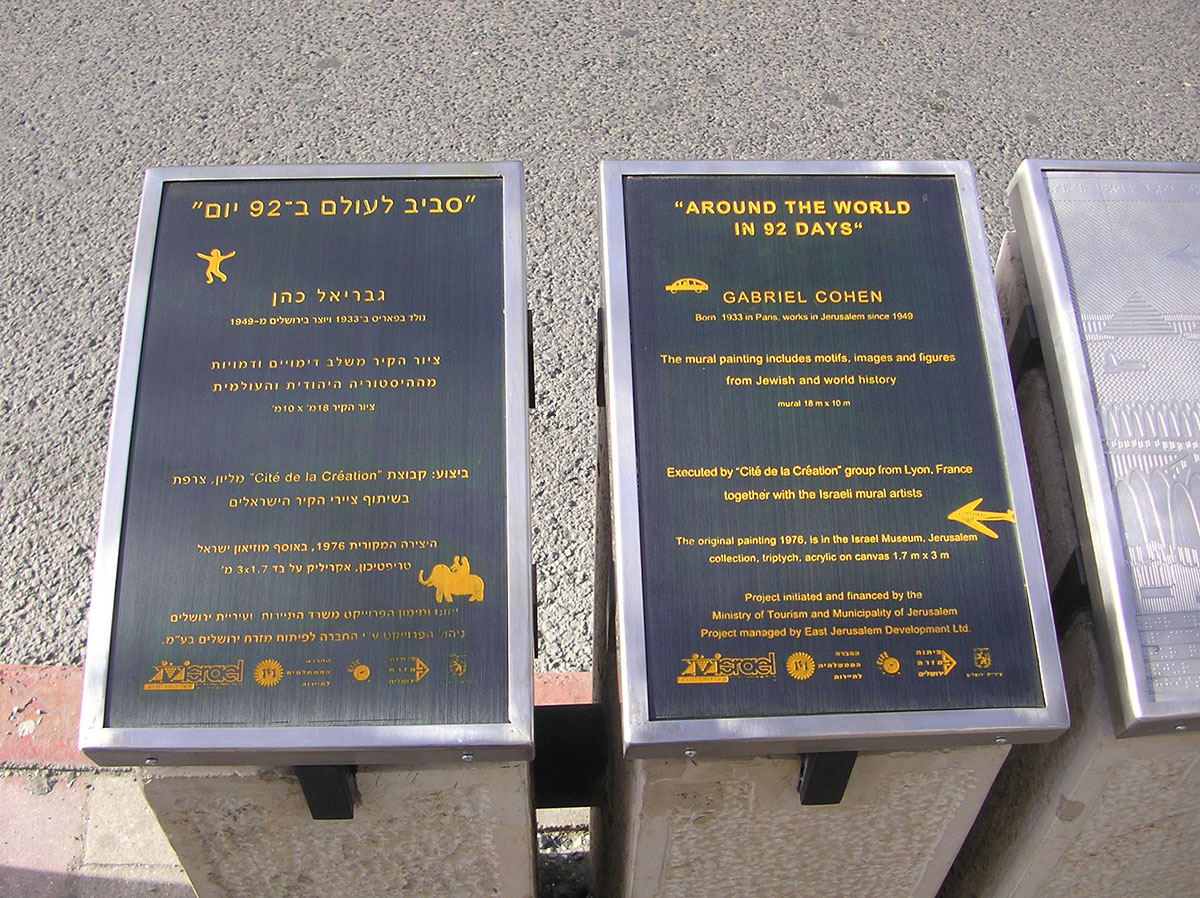 שילוט רחוב אומנותי, מוצב בירושלים באזור שוק מחנה יהודה ומספר את סיפורי העיר ותושבי העיר ההיסטוריים, שילוב של מתכת ואבן קרמית בהדפסה מיוחדת ועמידה לתנאי חוץ.