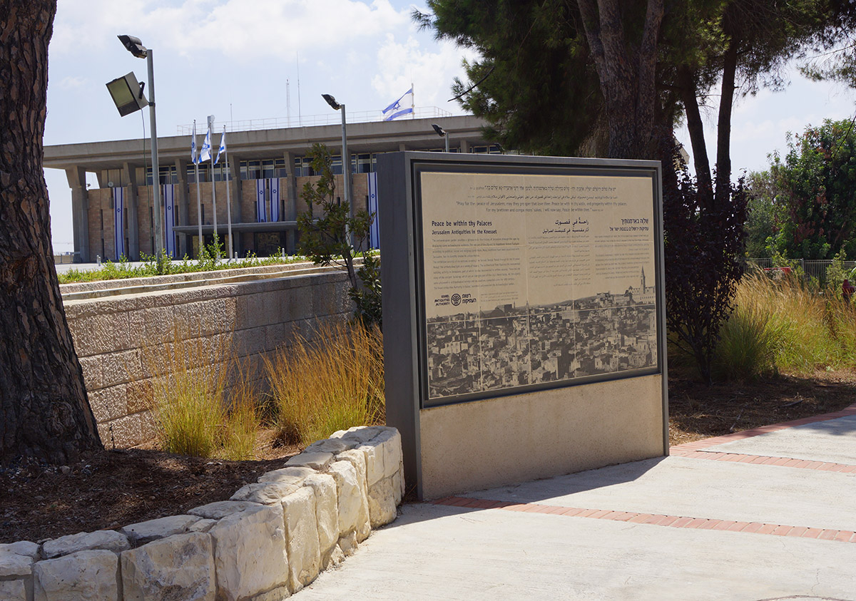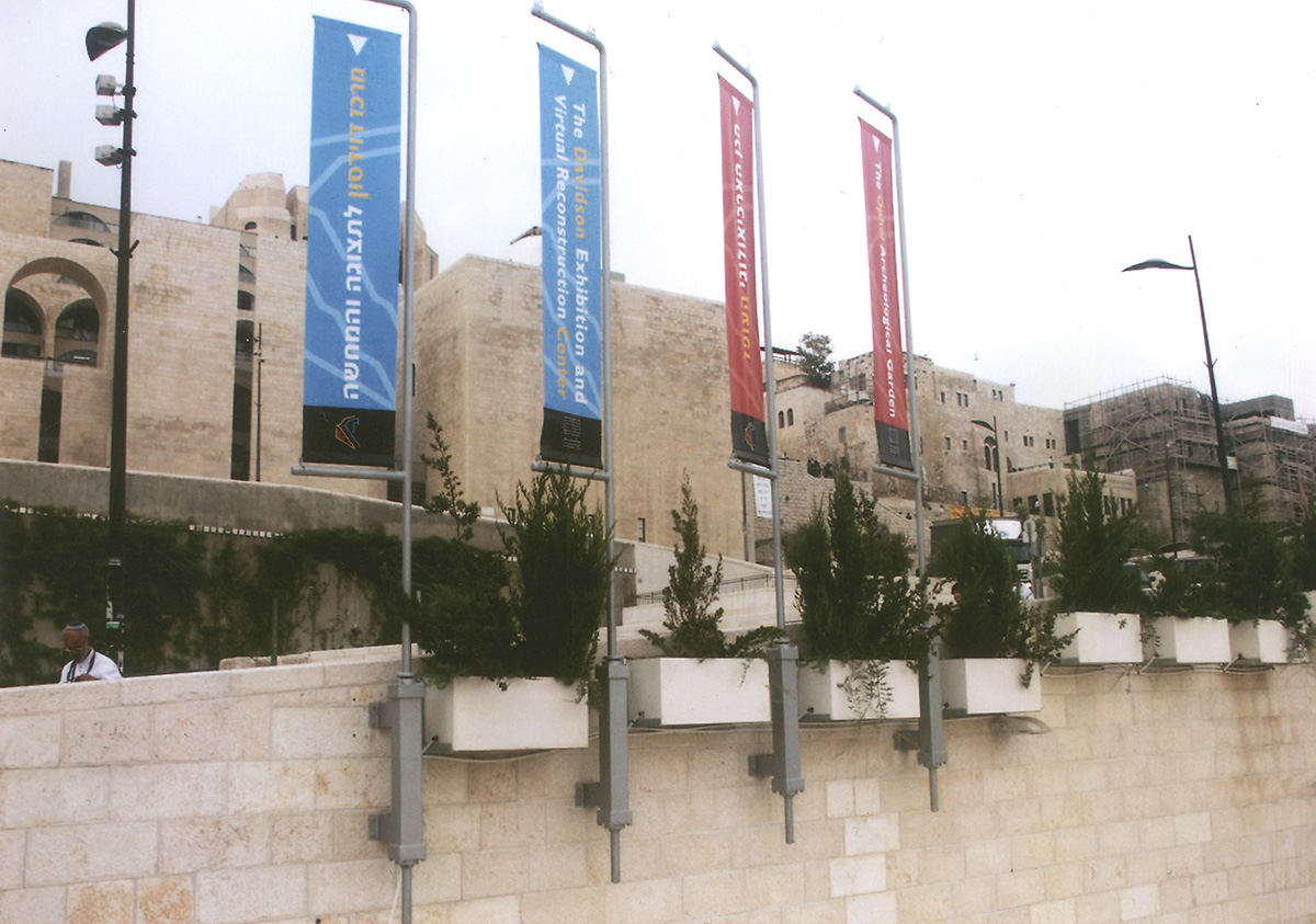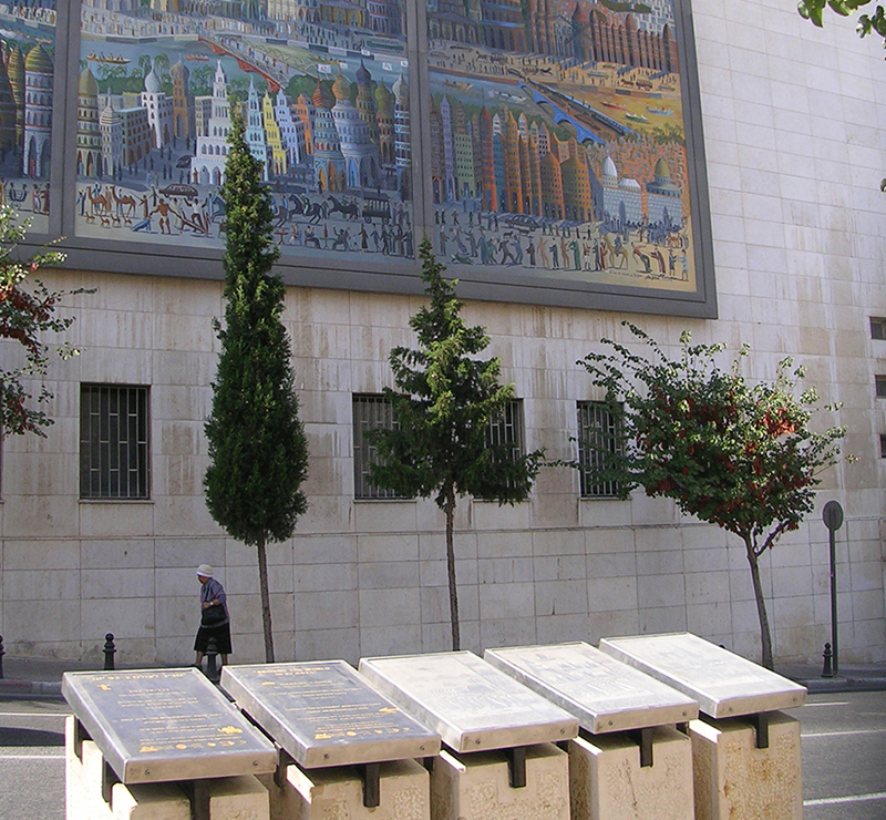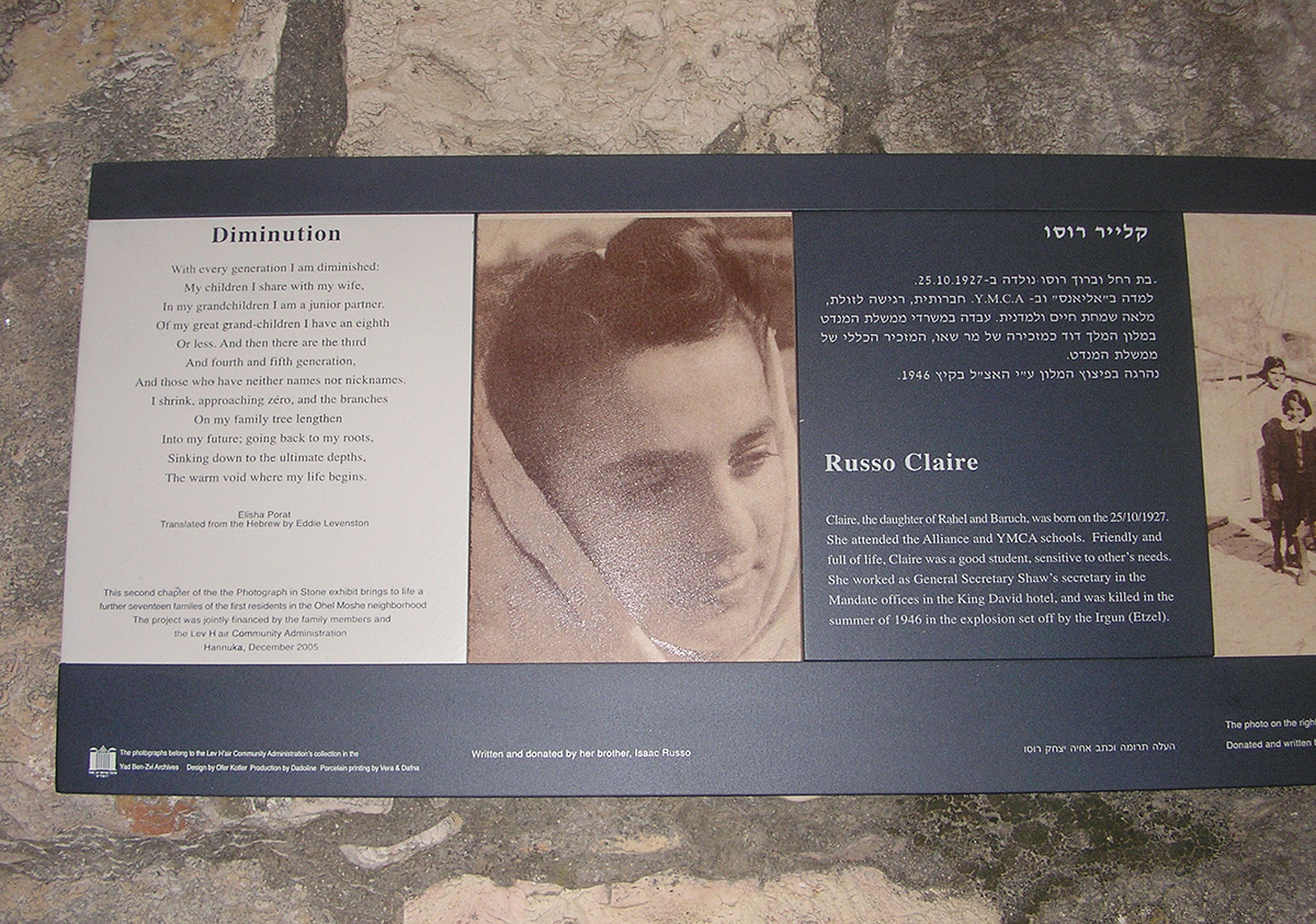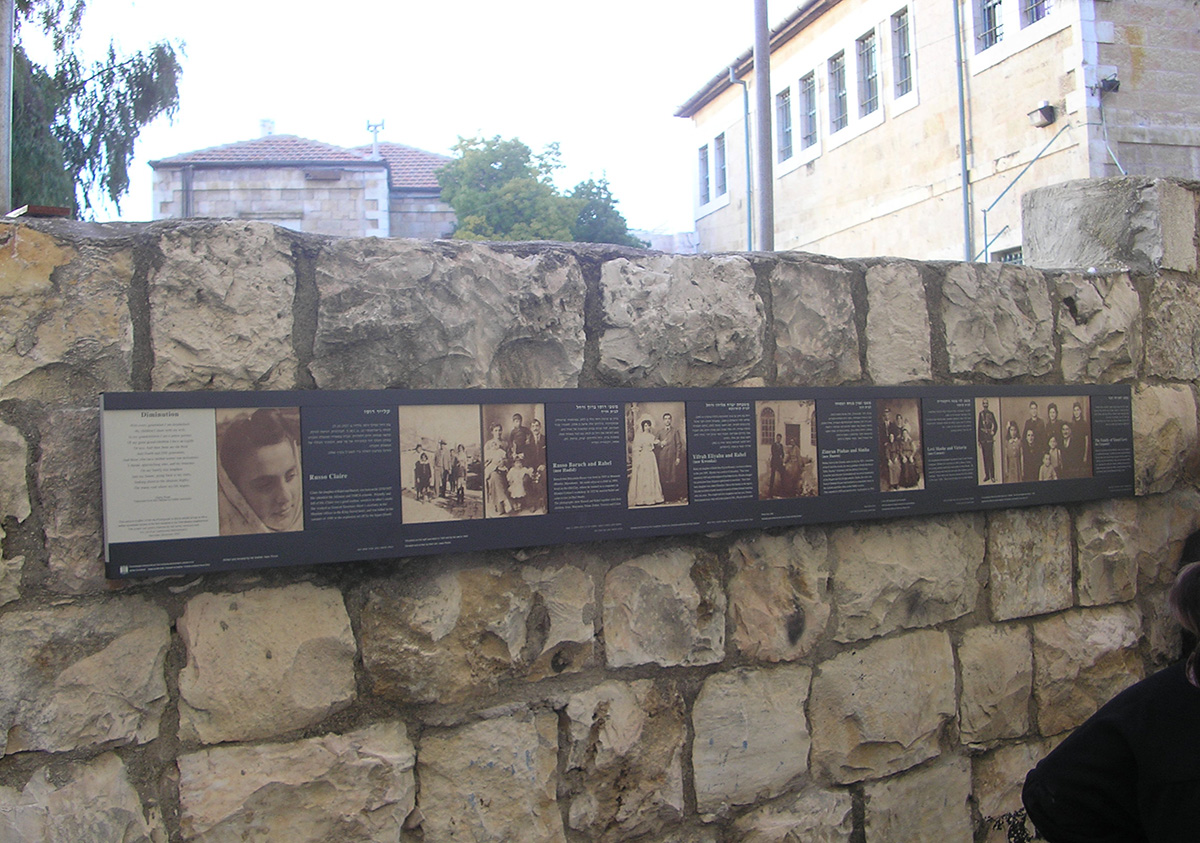 שילוט רחוב אומנותי, מוצב בירושלים באזור שוק מחנה יהודה ומספר את סיפורי העיר ותושבי העיר ההיסטוריים, שילוב של מתכת ואבן קרמית בהדפסה מיוחדת ועמידה לתנאי חוץ.