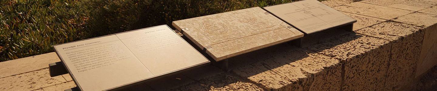 שילוט חוץ אומנותי מחומרים מיוחדים העמידים בתנאי שמש חום ורטיבות, באלבום מגוון תמונות מאתרים שונים - בינהם - מערות קומראן, גמלא, גן לאומי קיסריה, גן ארכיאולוגי הכנסת, שבטה ועוד...
