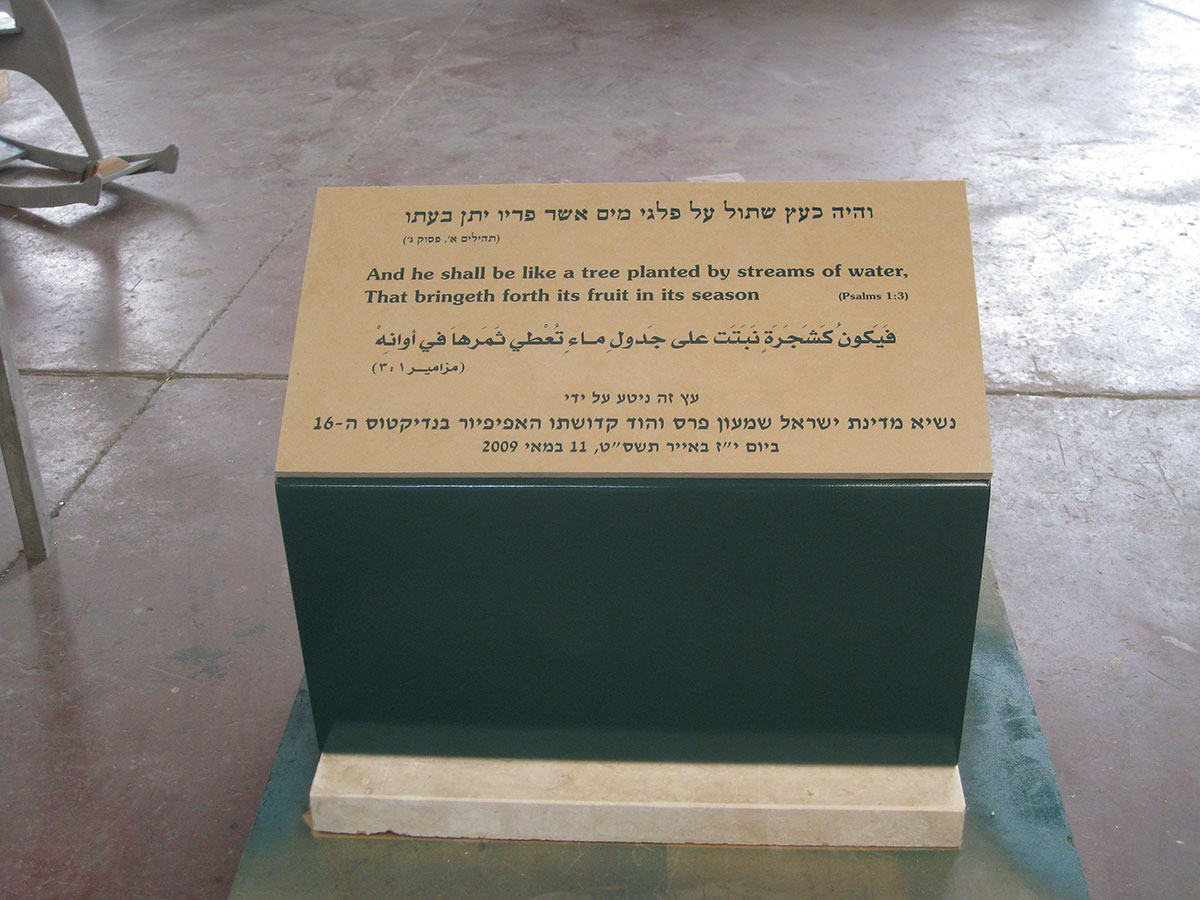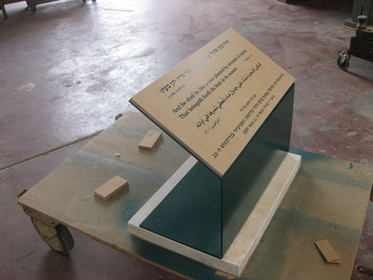 שילוט אומנותי מיוחד הכולל שילוב של סוגי זכוכיות שונים, מתכת פליז, ואותיות מתכת חתוכות בלייזר.